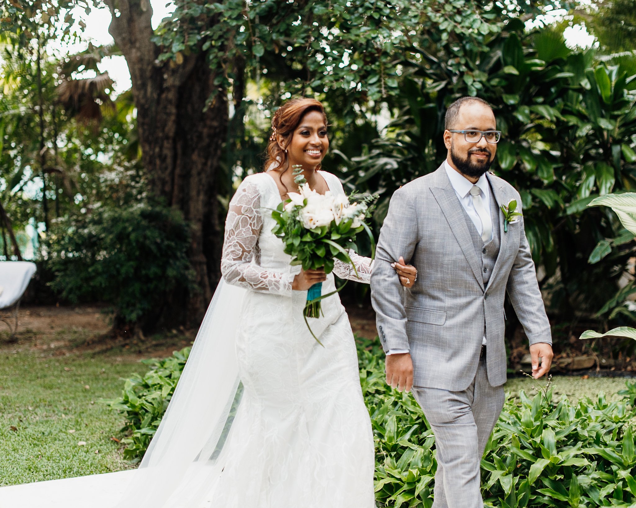 Veronique’s home in Trinidad was the perfect place for their intimate wedding. The outdoor ceremony was held beneath the large trees, which perfectly matched the white and green, classic decor.